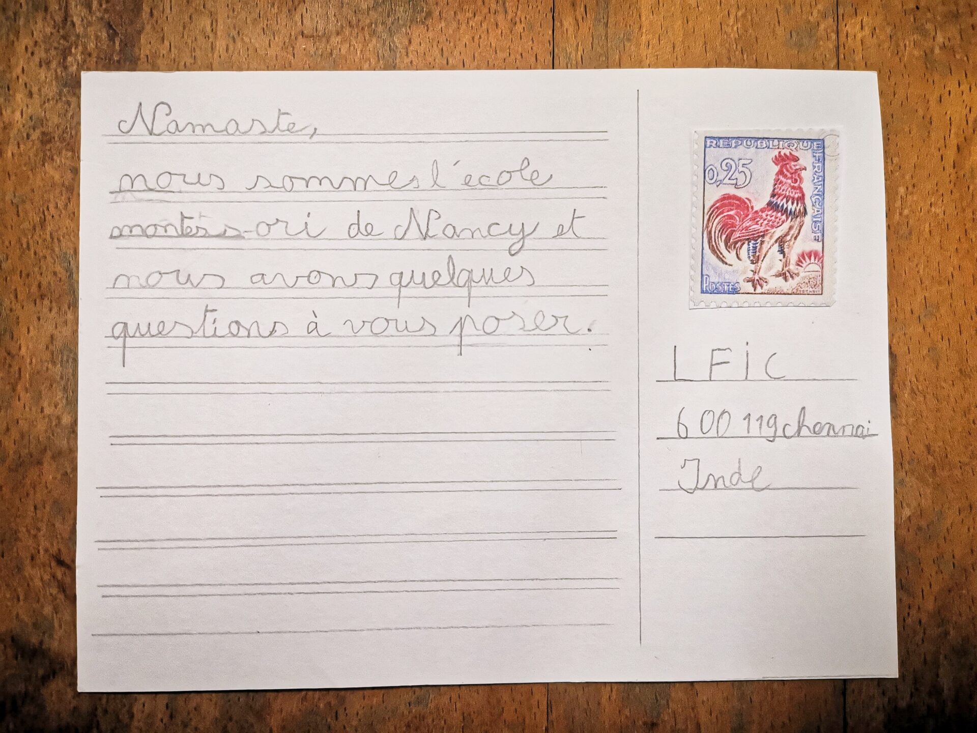 Afin d’aborder plus précisément la culture indienne, Laurie a lu aux enfants le livre La Tresse ou le voyage de Lalita, de Laetitia Colombani et Clémence Pollet, mentionnant le principe des Castes en Inde. Nos Explorateurs ont pu, par la suite, écrire sous forme de cartes postales, des questions bien précises sur ce qu’ils voulaient savoir sur ce pays afin que les élèves de l’école de Chennai puissent, à leur tour, nous raconter leur quotidien. En voici quelques exemples :
